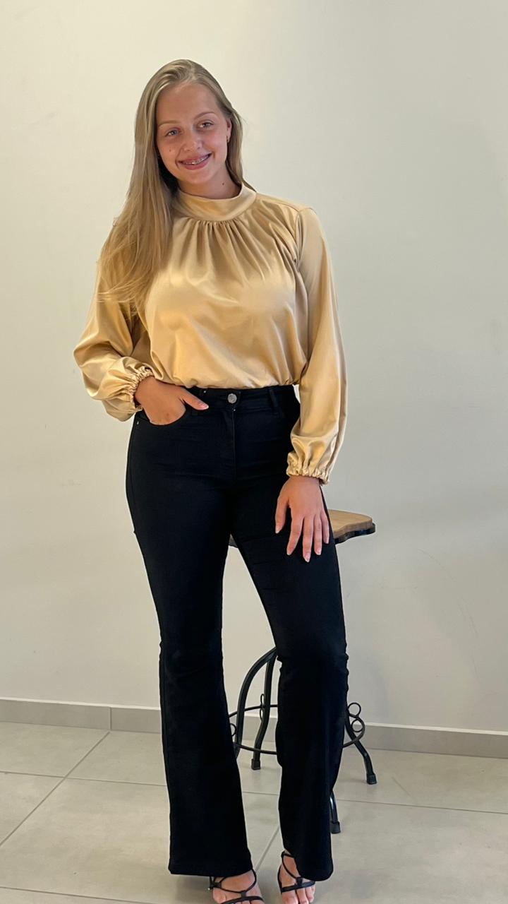 (O cetim não possui elastano, então a modelagem solta garante o conforto necessário).